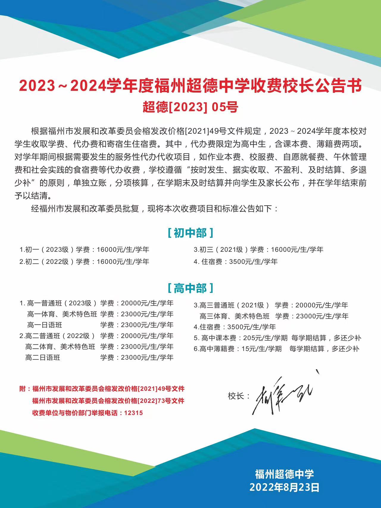 2023~2024学年度福州超德中学收费校长公告书